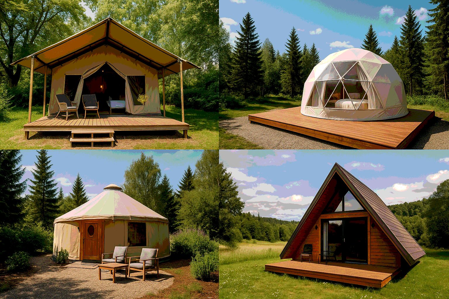 - Архитектурные решения: геокупола, стеклянные домики, современные минималистичные шатры.